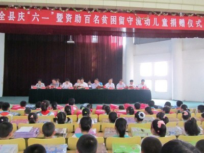 為幫助農村貧困留守流動兒童繼續學業,努力營造關愛貧困兒童健康發展的良好環境,2011年5月31日,沂水縣婦聯在第三實驗小學舉行了全縣慶“六一”暨資助百名貧困留守流動兒童捐贈儀式, 儀式現場向30名留守流動兒童代表各發放500元資助金、書包及食品。這次活動全縣有170余名貧困留守流動兒童接受愛心人士資助,資助金額達10萬余元。魯洲集團一次就結對資助了102名貧困留守流動兒童。